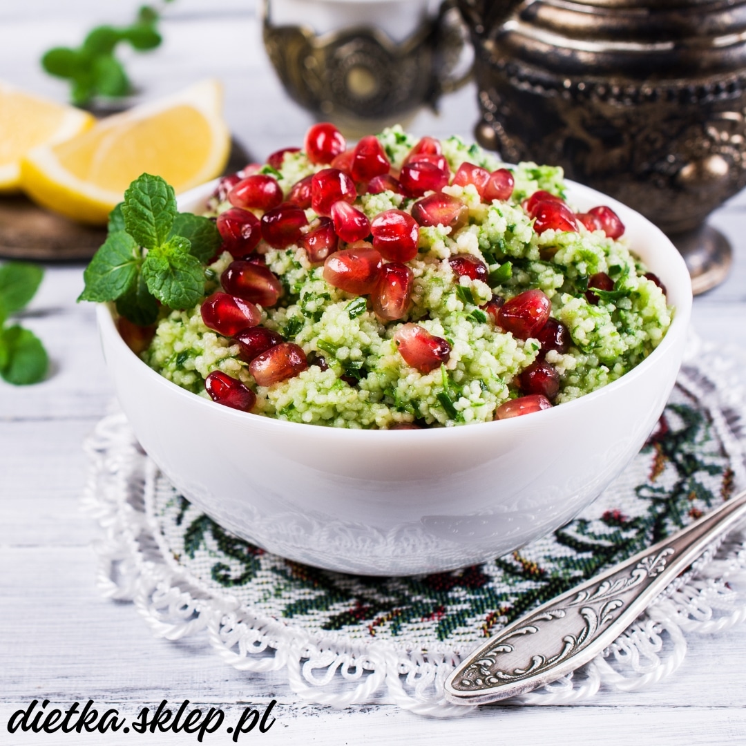Kuskus z granatem i pistacjami Połączenie kuskusu, cytryny, orzechów, ziół i granatu nadaje temu daniu orzeźwiający smak