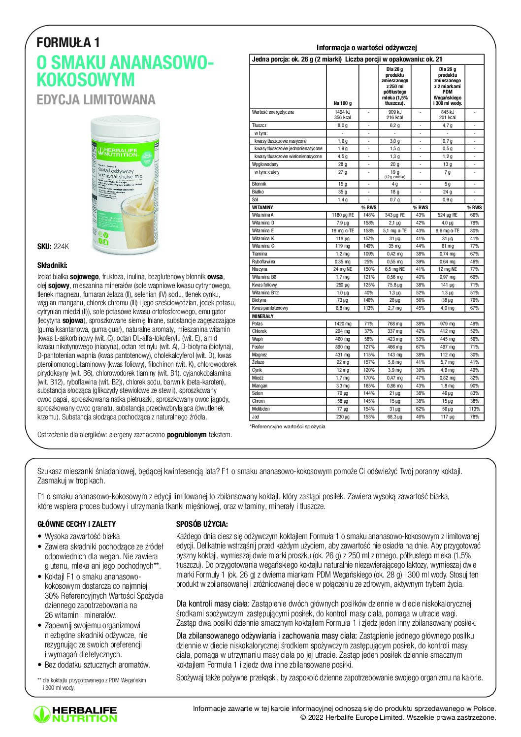 Pełnowartościowy vegan meal replacement tropikalny – dostarcza minimum 30 % dziennego zapotrzebowania na 26 witamin i minerałów